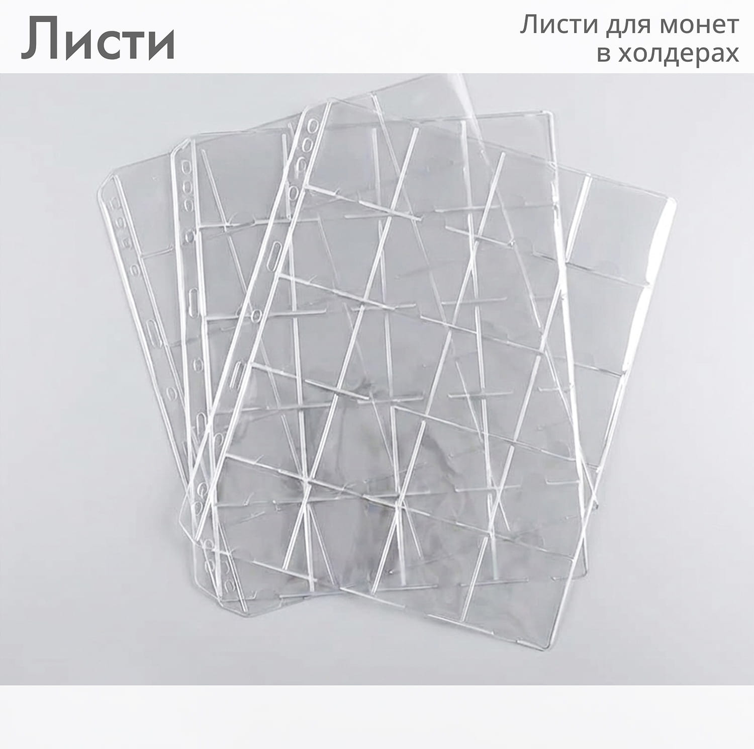 Листи для монет з 20 кишенями для монет у холдерах (формат A4, стандарт Grande ). Листи сумісні з нашими крафтовими альбомами та усіма папками цього формату, такими як Leuchtturm GRANDE, Leitz, Kammer та інші.